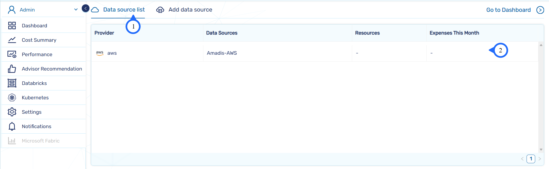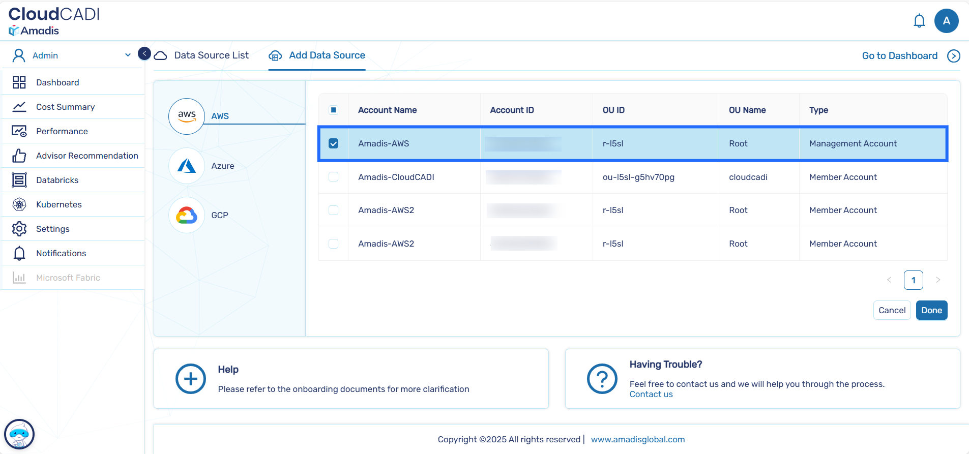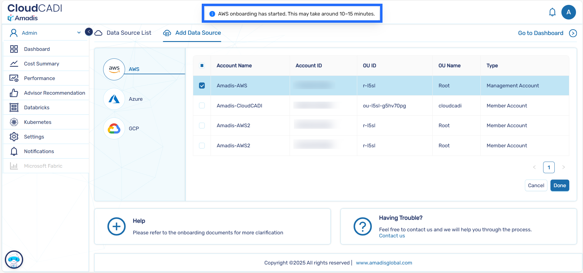 - CloudCADI displays the list of AWS Accounts discovered under the organization.