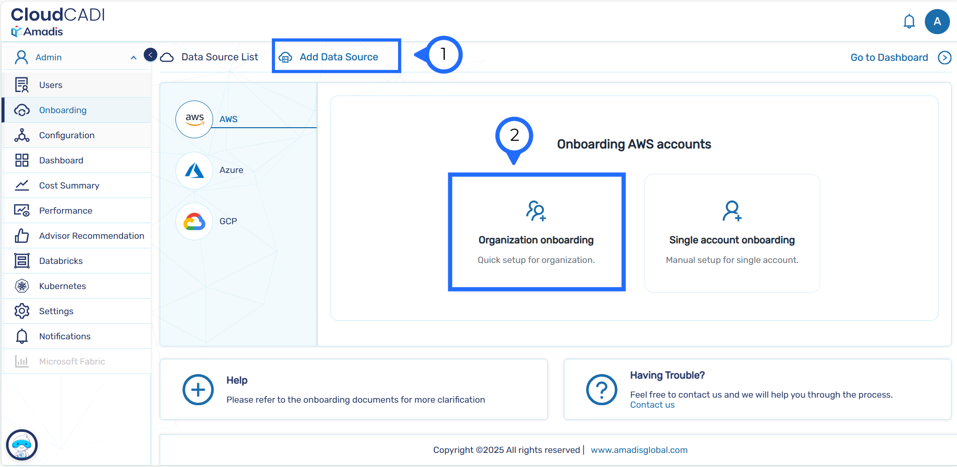 This section explains how an Admin can onboard AWS accounts into CloudCADI using the Organization onboarding flow.