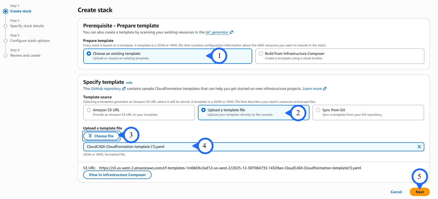 After downloading the script, go to the AWS Console for the respective account, navigate to the CloudFormation service, and create a stack with new resources.