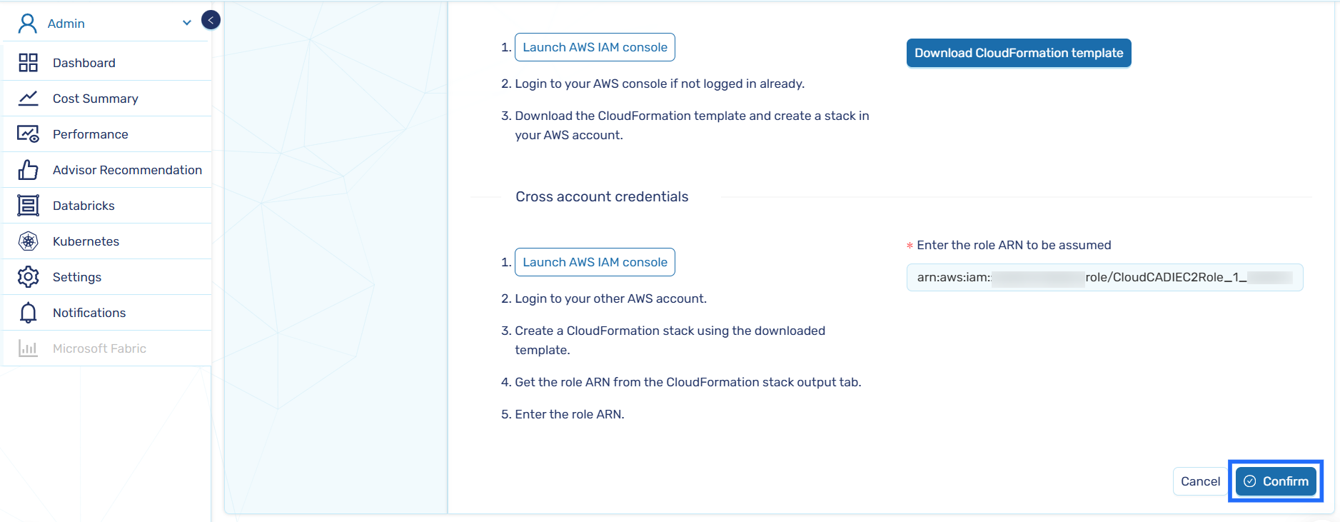 Paste the Role ARN obtained during stack creation and click Confirm.