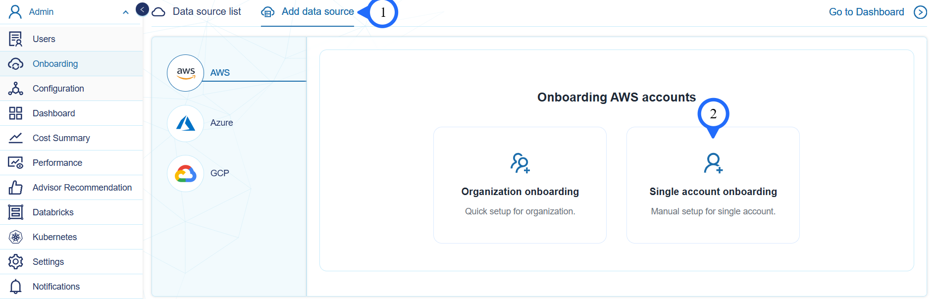 In the Add Data Source tab select Single Account Onboarding.