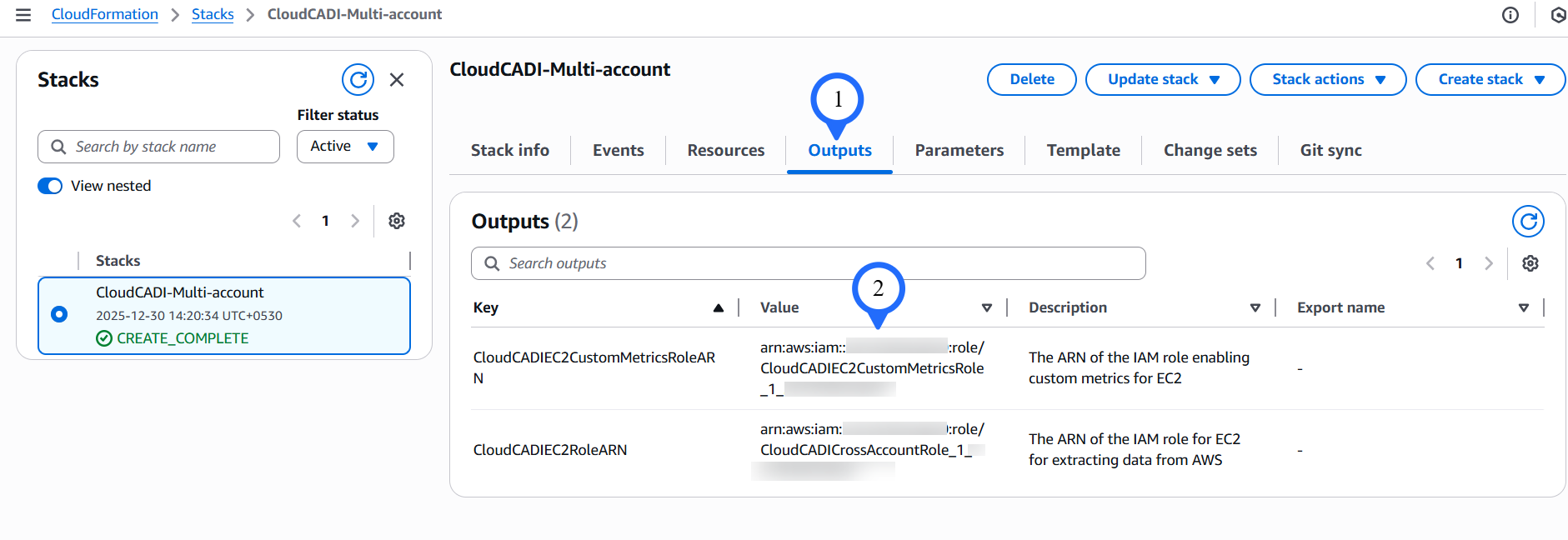 Once the stack has been created successfully, go to the Outputs tab. Copy the Role ARN