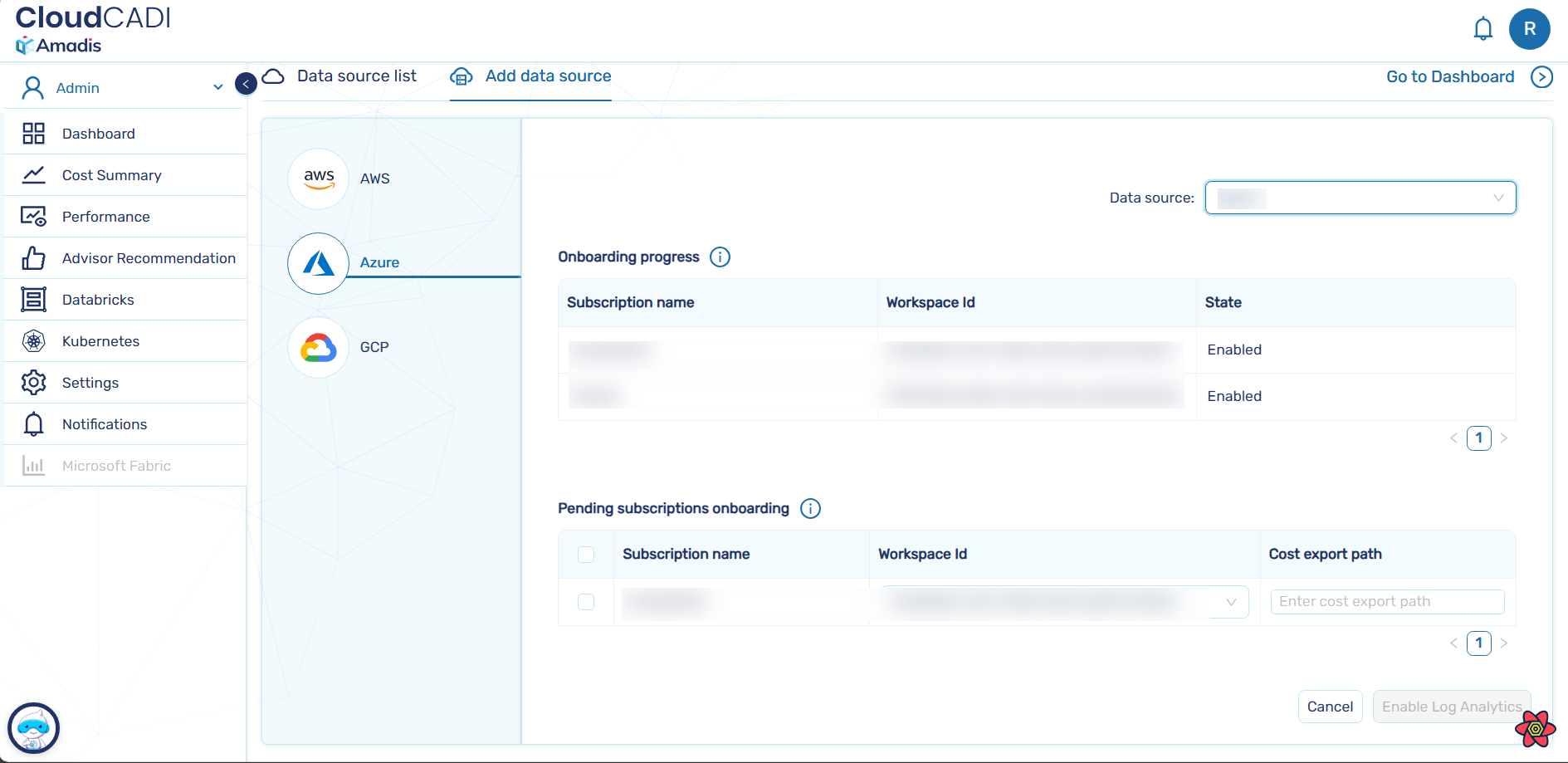 When the data source is selected, Onboarded subscription details are shown with its state only after it is enabled.