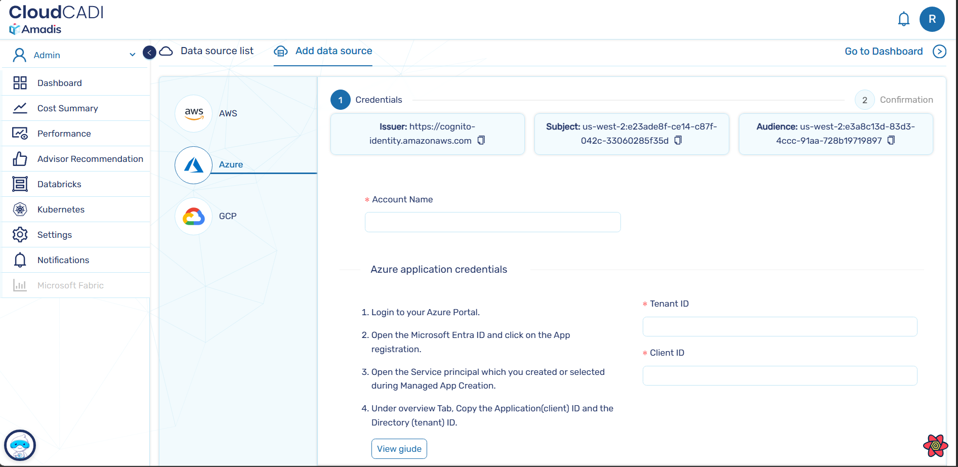 - From the list of cloud providers, select Azure.