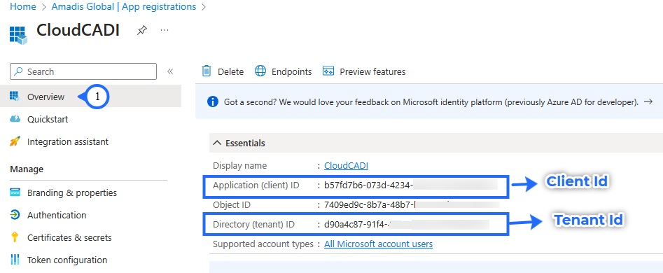 - Under overview Tab, Copy the Application(client) ID and the Directory (tenant) ID.
