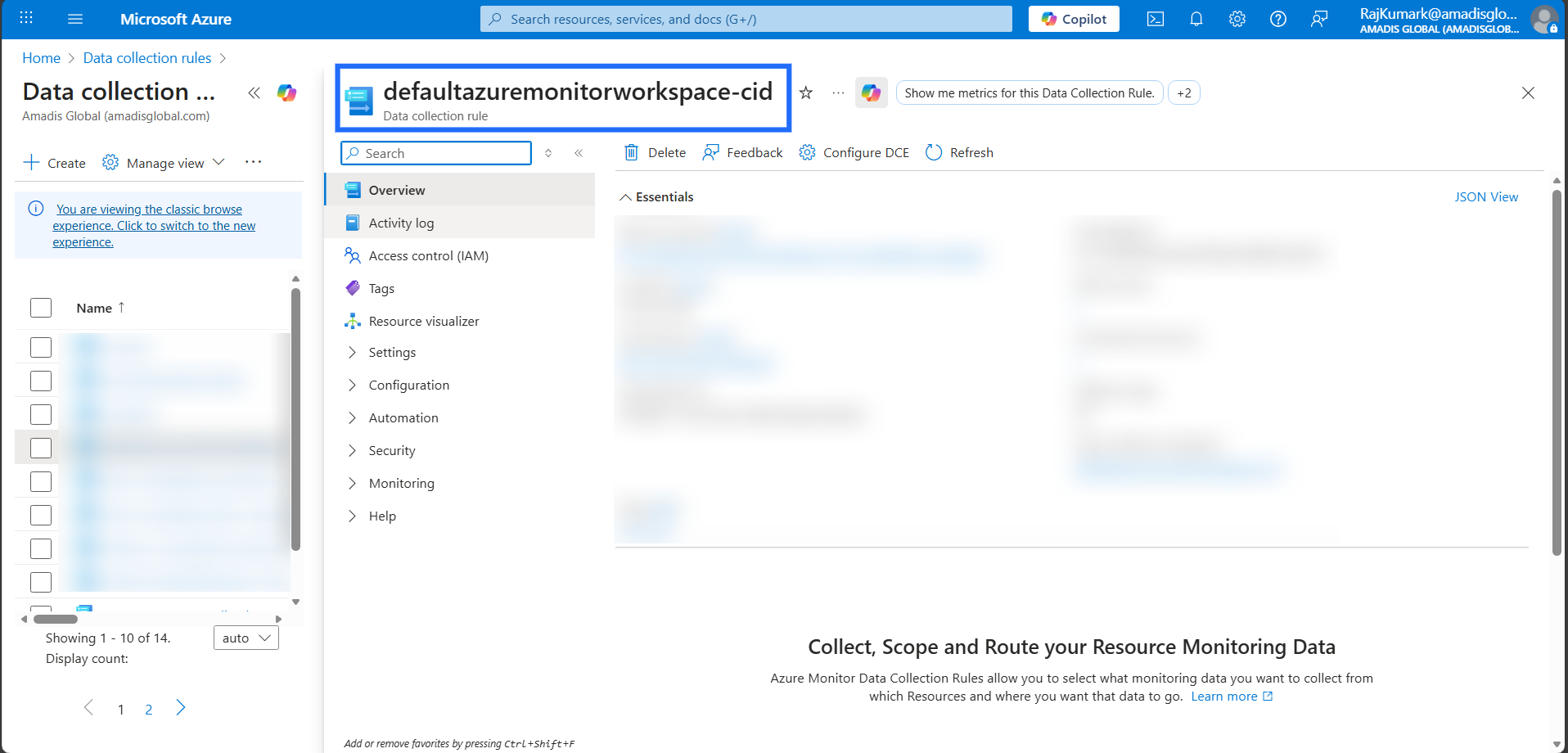 - Enter the required fields Acount name and DCR name(Data Collection Rule).