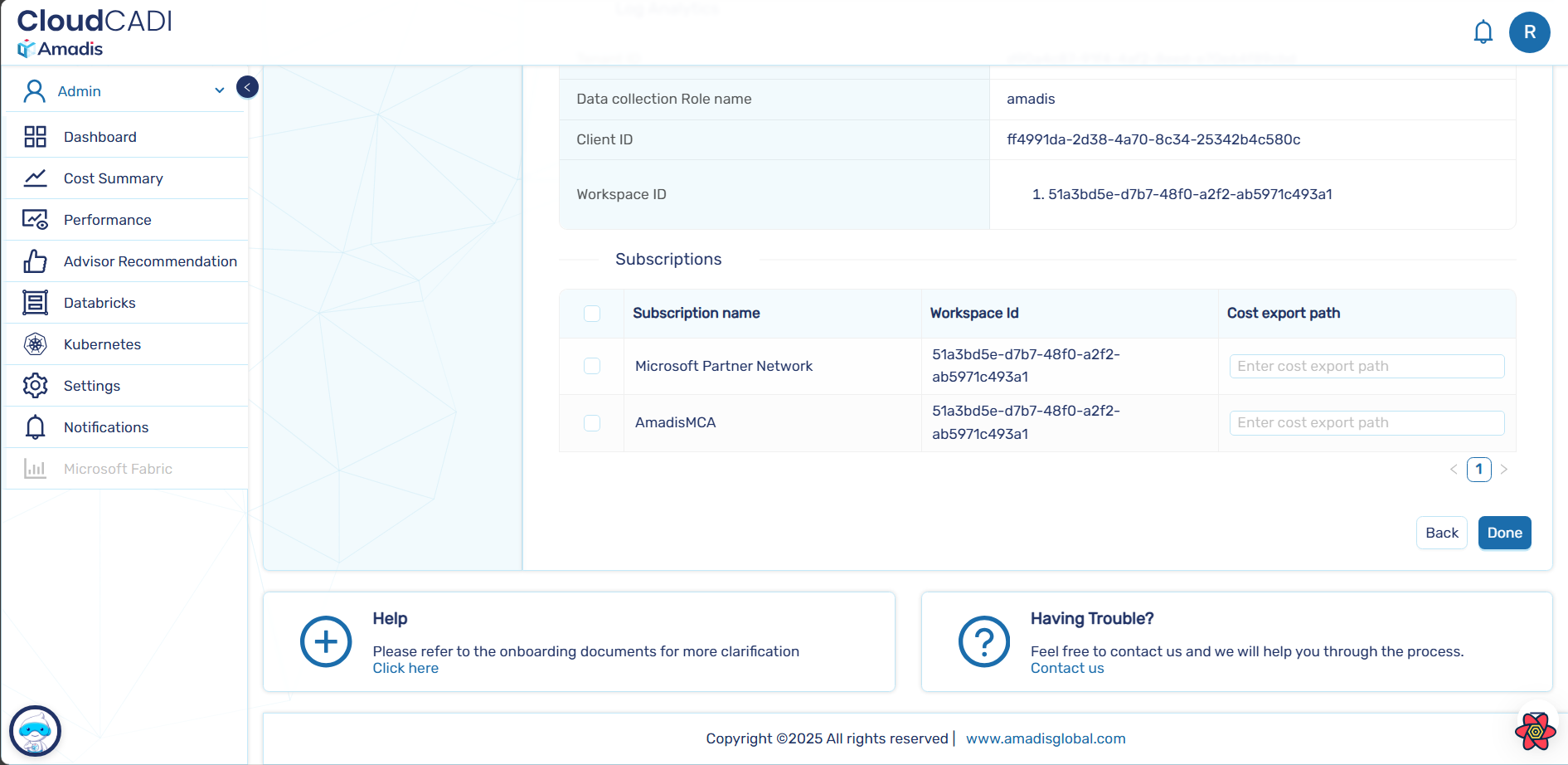6. After clicking "Done", the cloud credentials are stored in the database and it will direct to the manage azure subscription page.