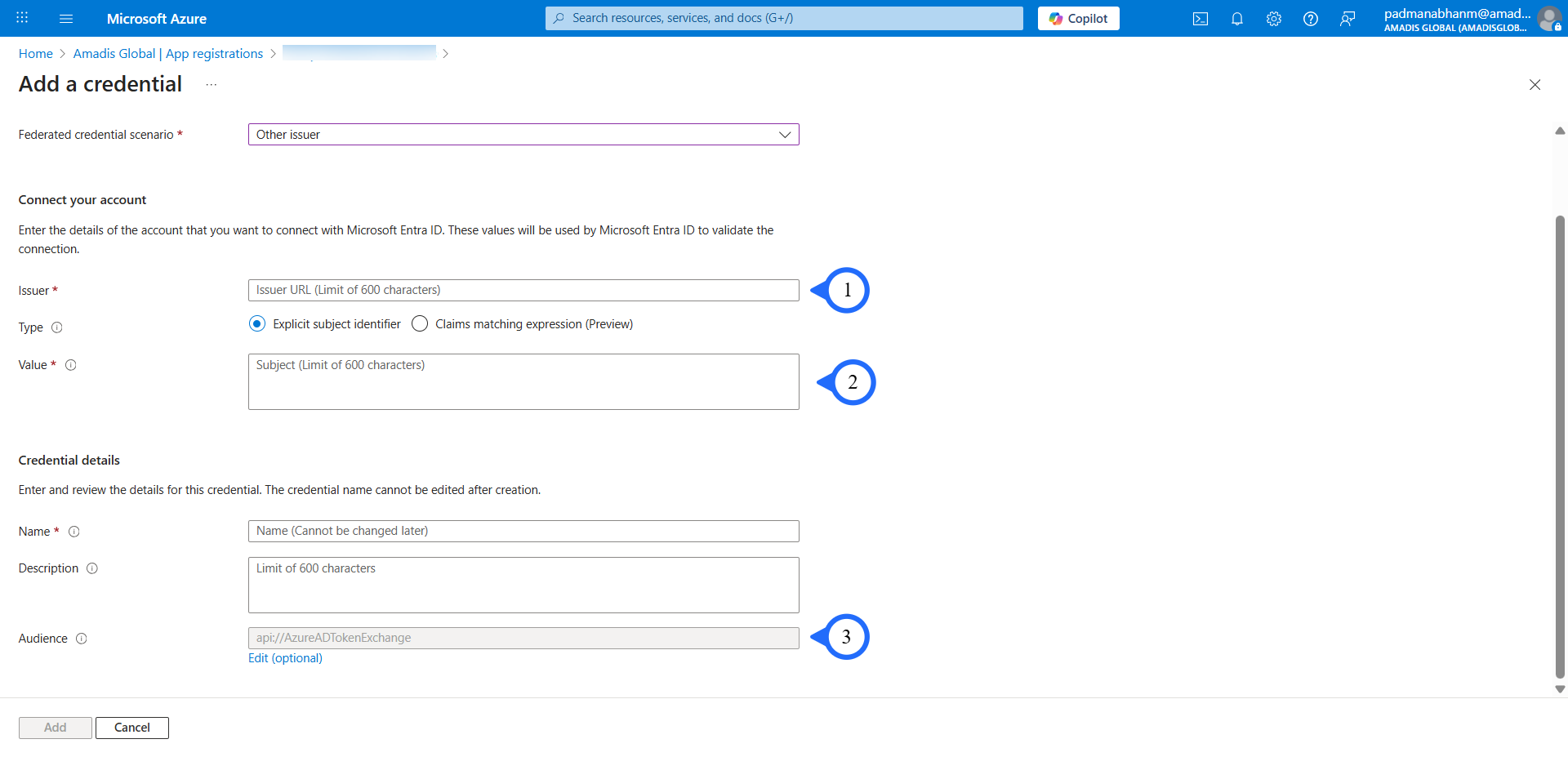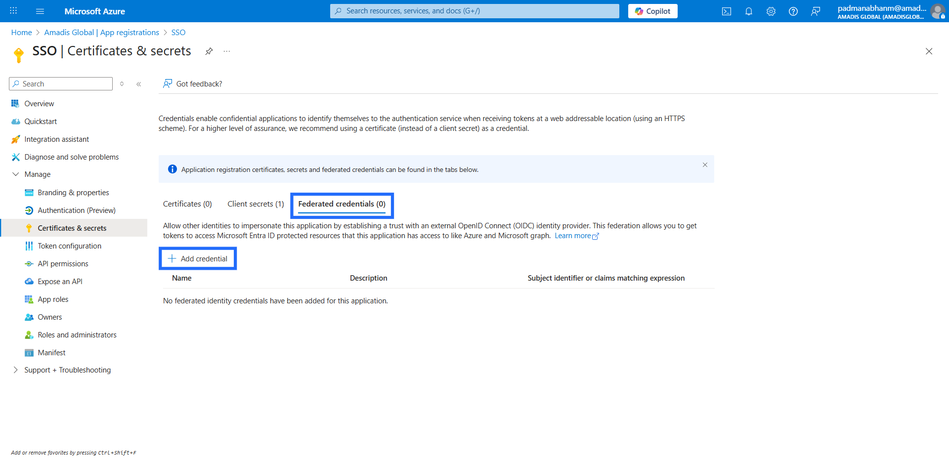 Go to the registered app, click on "Certificates & secrets", select "Federated credentials", and then click "Add credential".