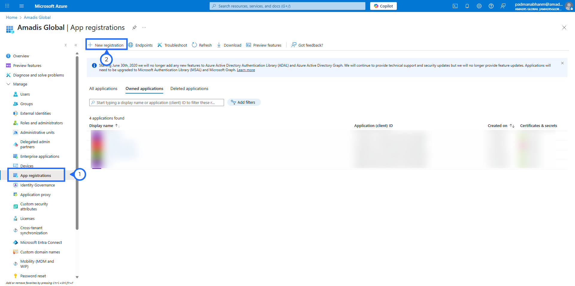 Extend Manage section and Click on “App registrations” and select "New registration".
