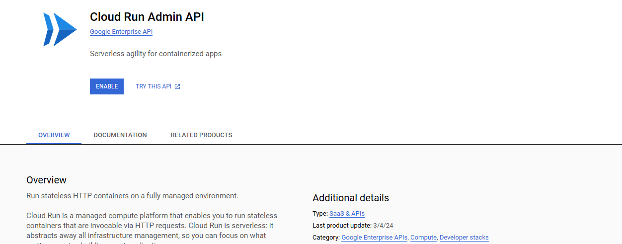 1. Enable the Cloud Run Admin API if it is not already enabled.