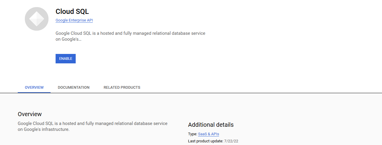 1. Enable the Cloud SQL API if it is not already enabled.