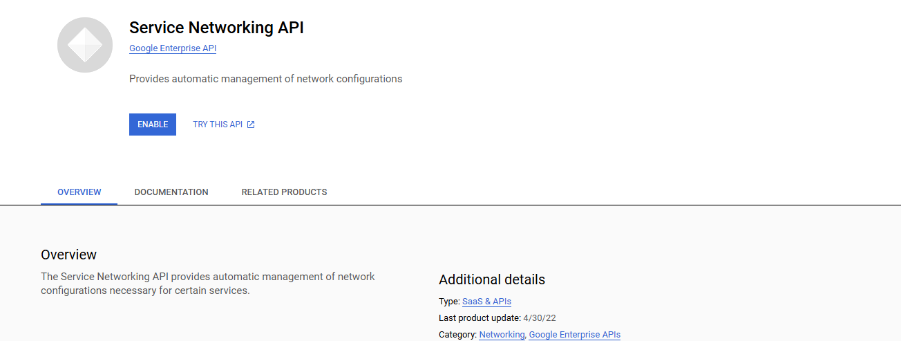 1. Enable the Service Networking API if it is not already enabled.