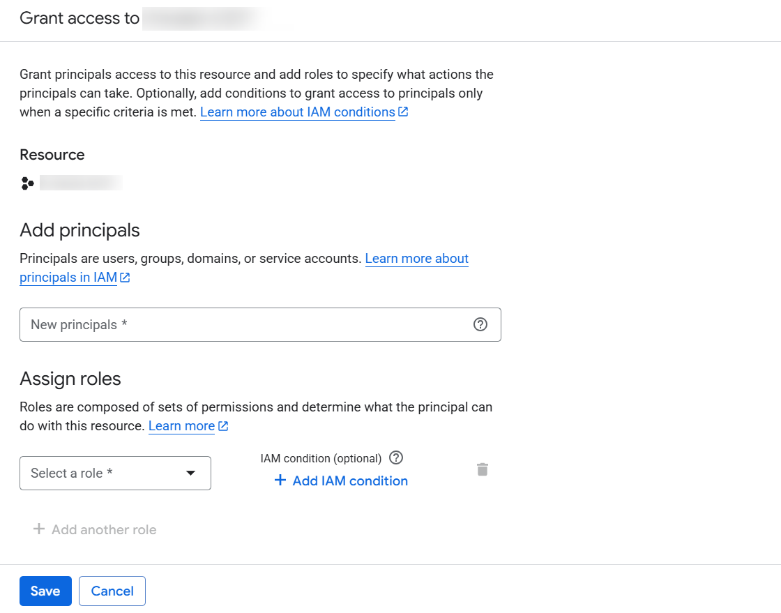4. Under Select principals (identities that can access the service account), provide the correct name–value pair: