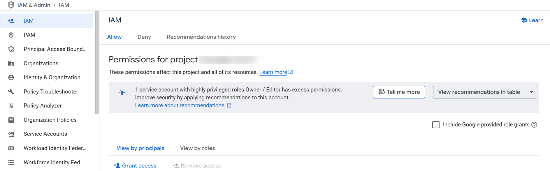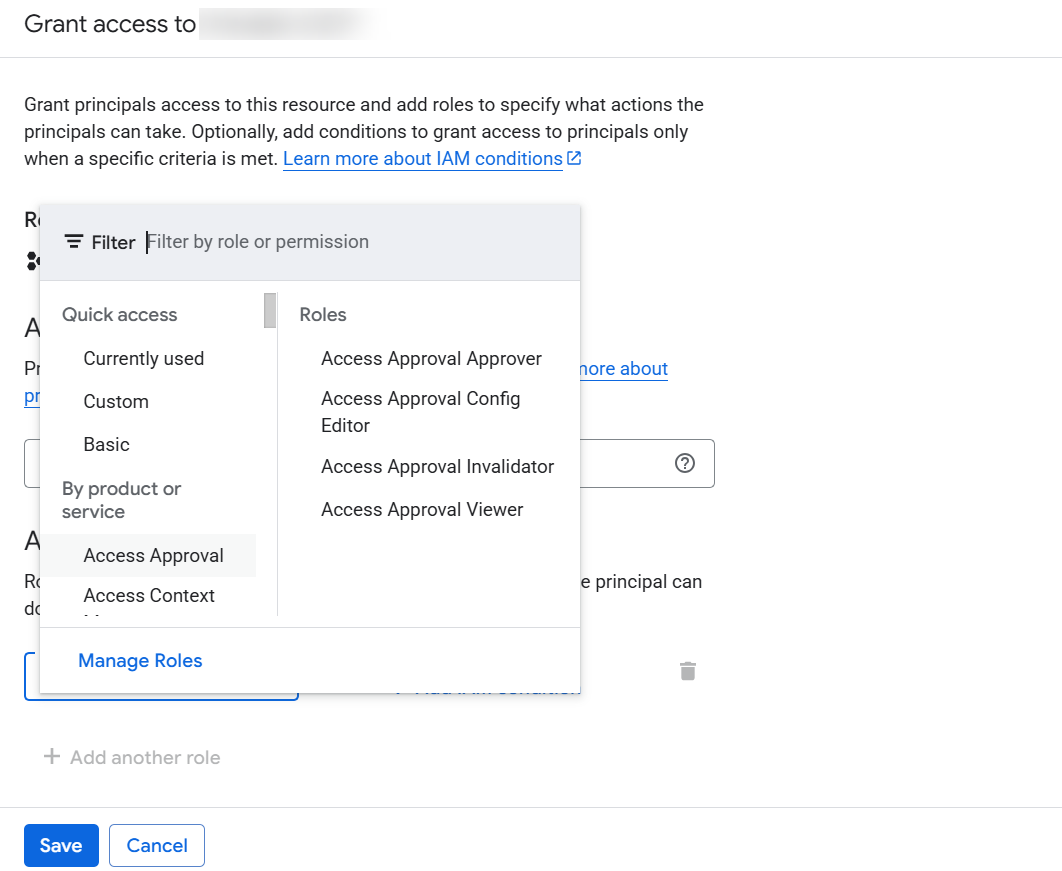 2. Click Grant Access to assign one or more IAM roles to a user or service account for a specific project specify Report