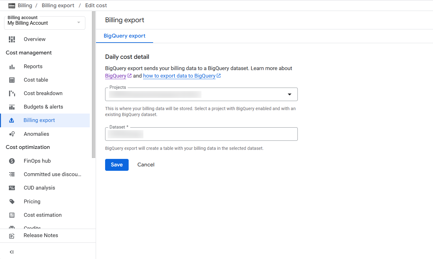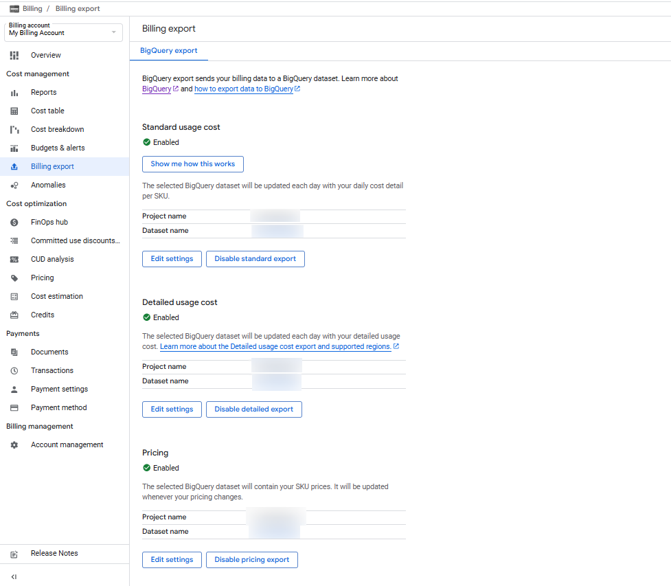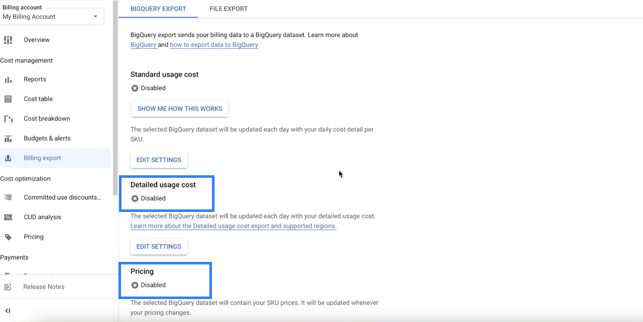 specify Report 6. Click Edit Settings for both Detailed Usage Cost and Pricing. specify Report 7. Select the project and dataset where you want to store the billing and pricing data. specify Report 8. After enabling the export, the page will appear as shown below. specify Report