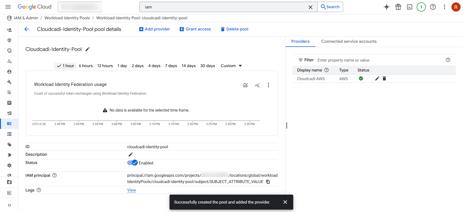 5. The Workload Identity Pool is now created successfully. You will see the pool listed with a green status indicator.