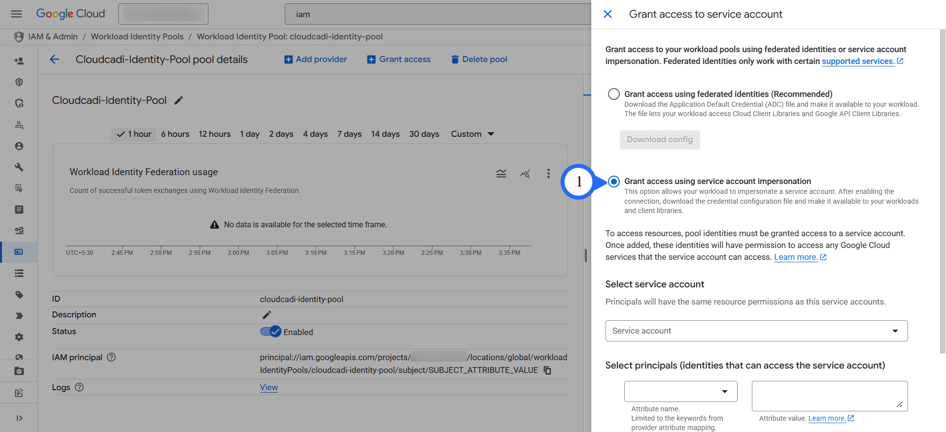 2. A popup will appear on the right side. Select Grant access using service account impersonation. image.png