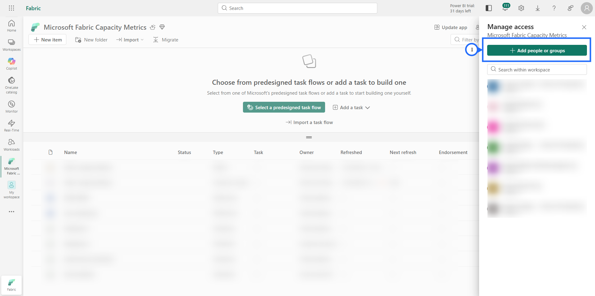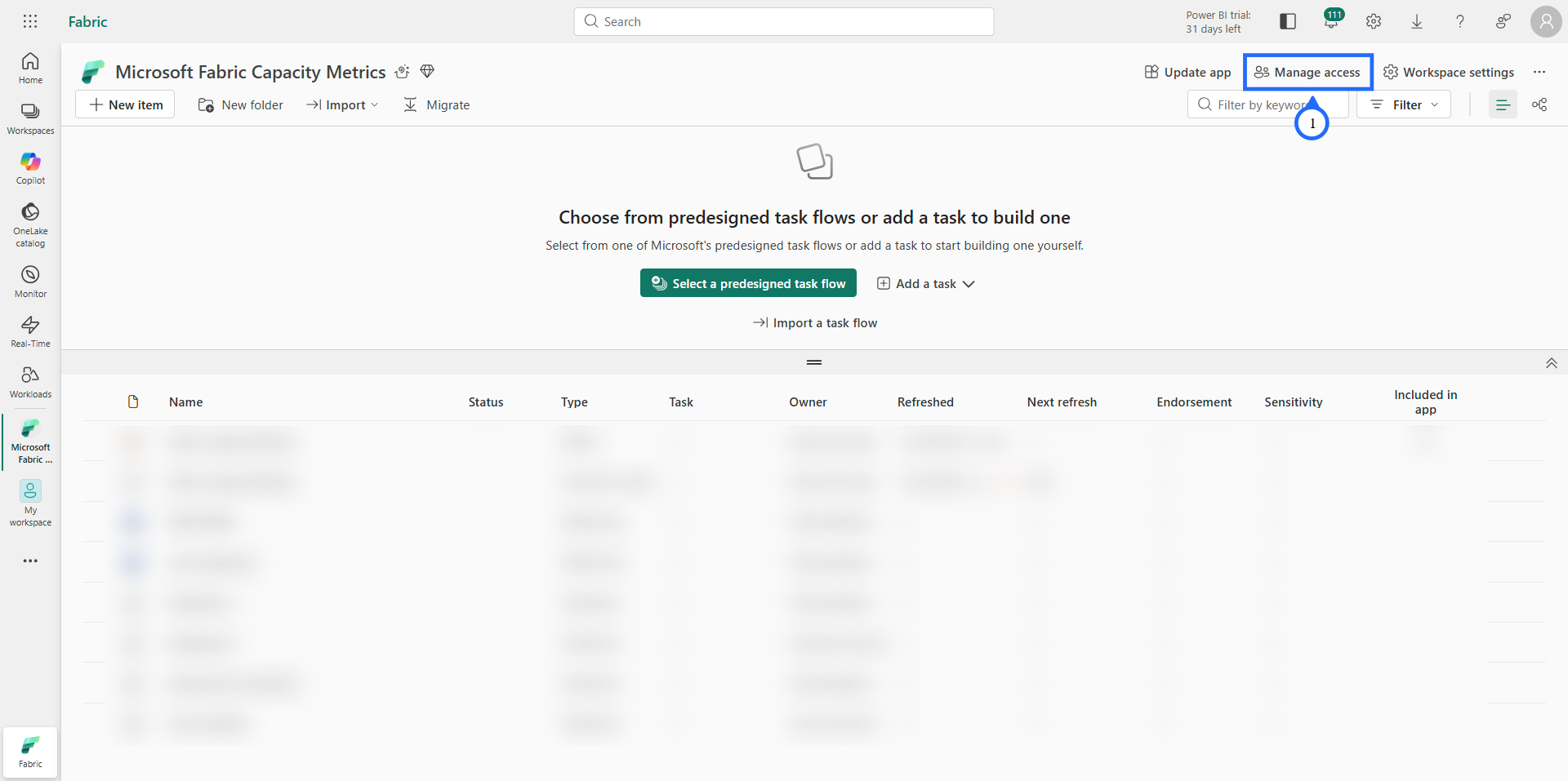 - Select the specific Microsoft Fabric Capacity Metrics workspace where you want to create and run the notebook and select the "Manage access" in the top right corner.