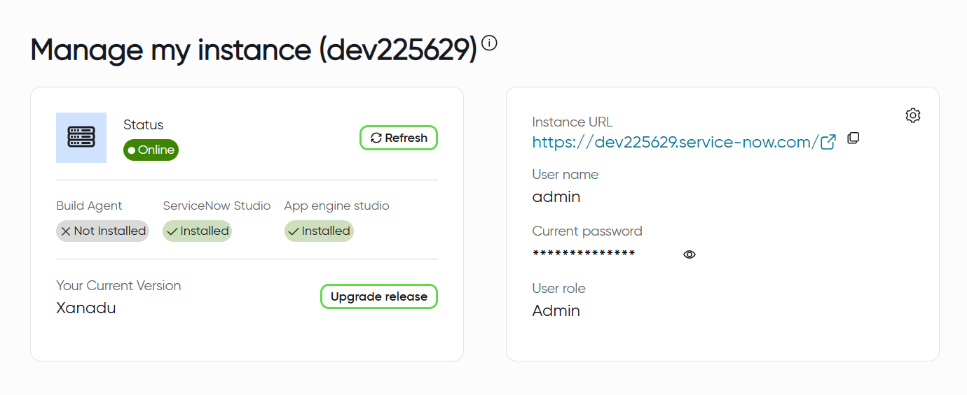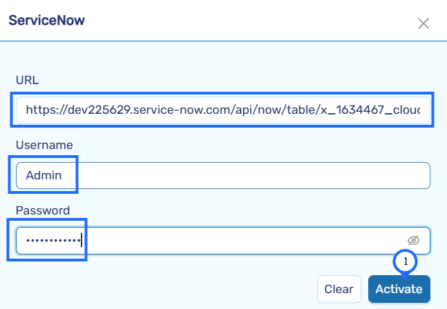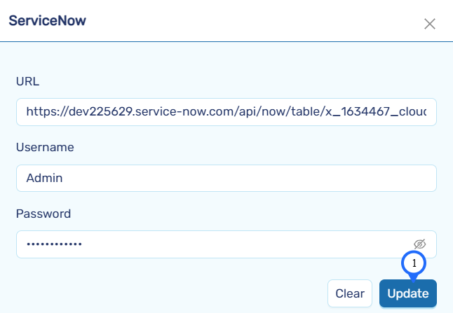 Provide the Username and Password received from ServiceNow. If you have forgotten your credentials, visit the ServiceNow Developer Website, click on your profile icon, and select Manage Instance Password to retrieve your credentials.