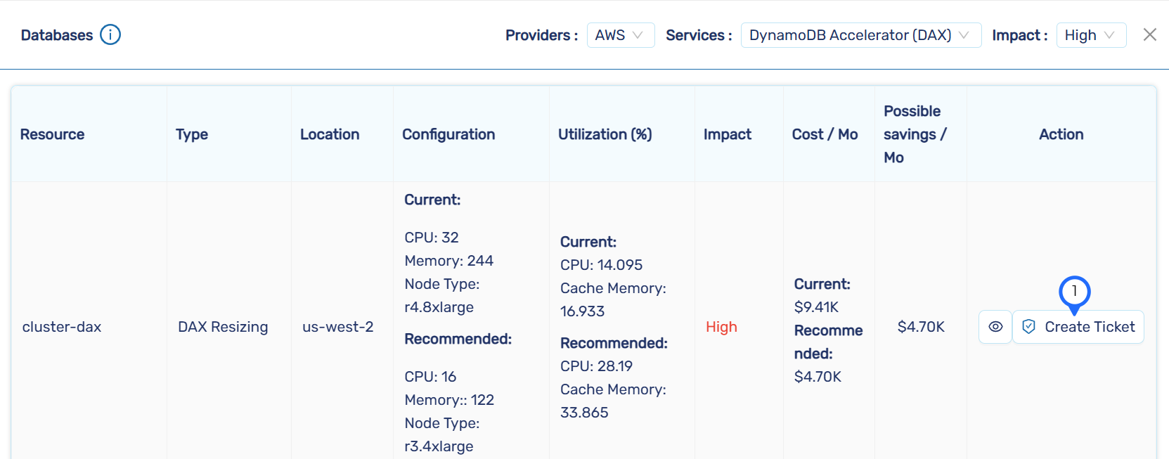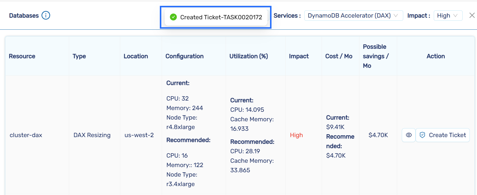 To verify the ServiceNow Integration, Go to the CloudCADI Recommendation page and click the Create Ticket button.