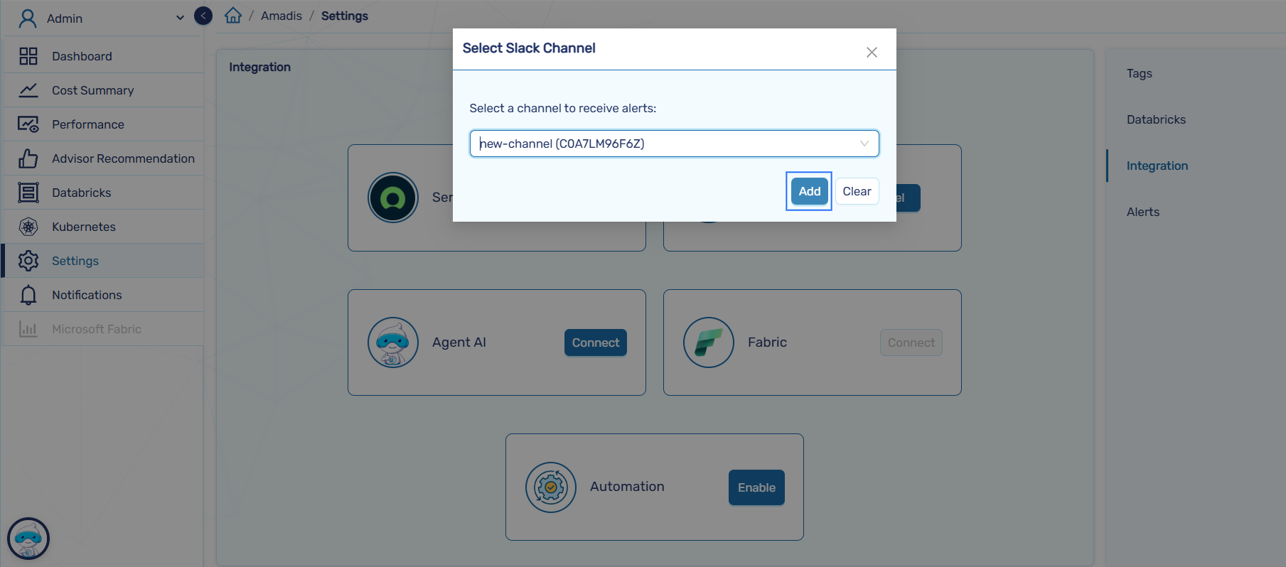 - To integrate slack, Go to CloudCADI Settings and click Integrations and click Add to Slack.