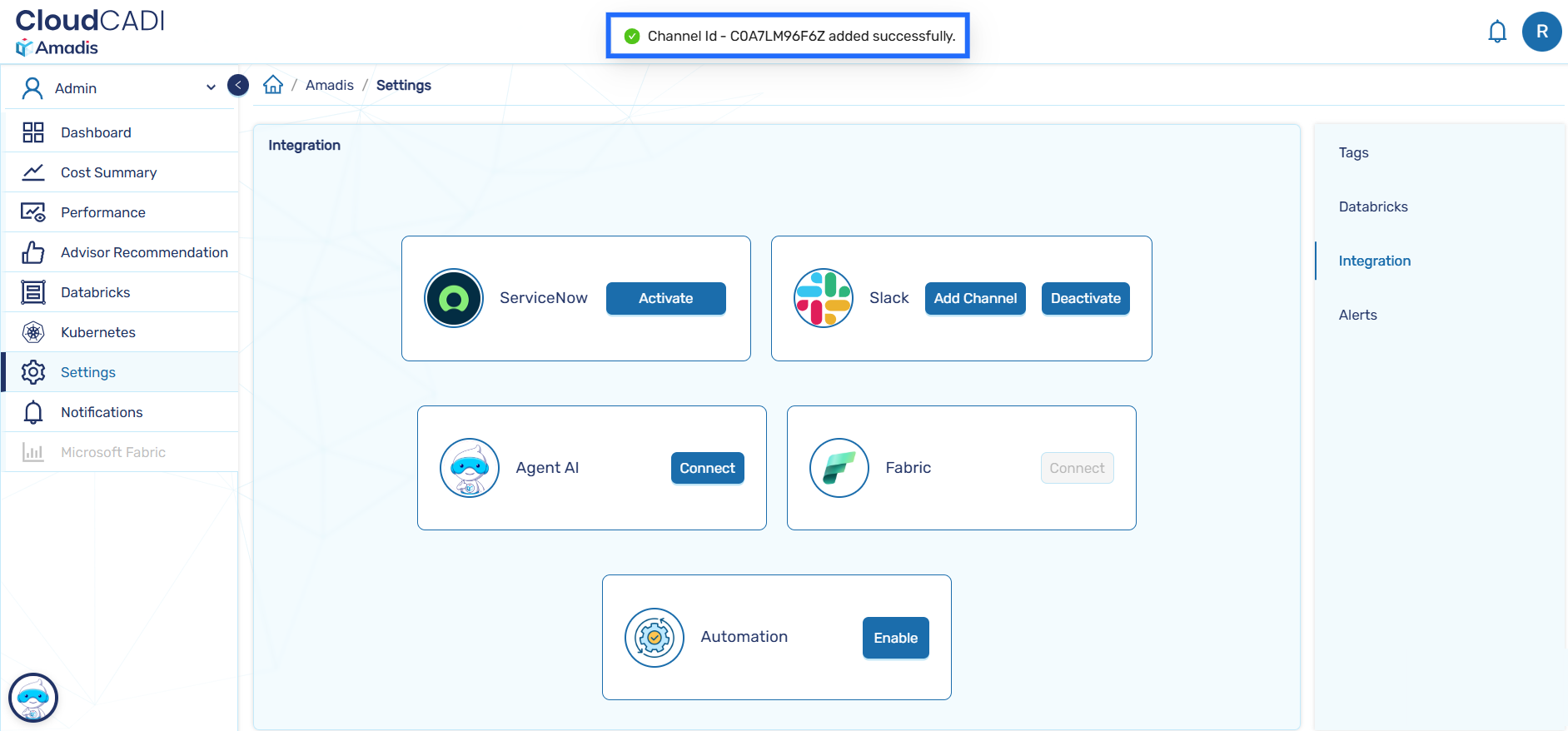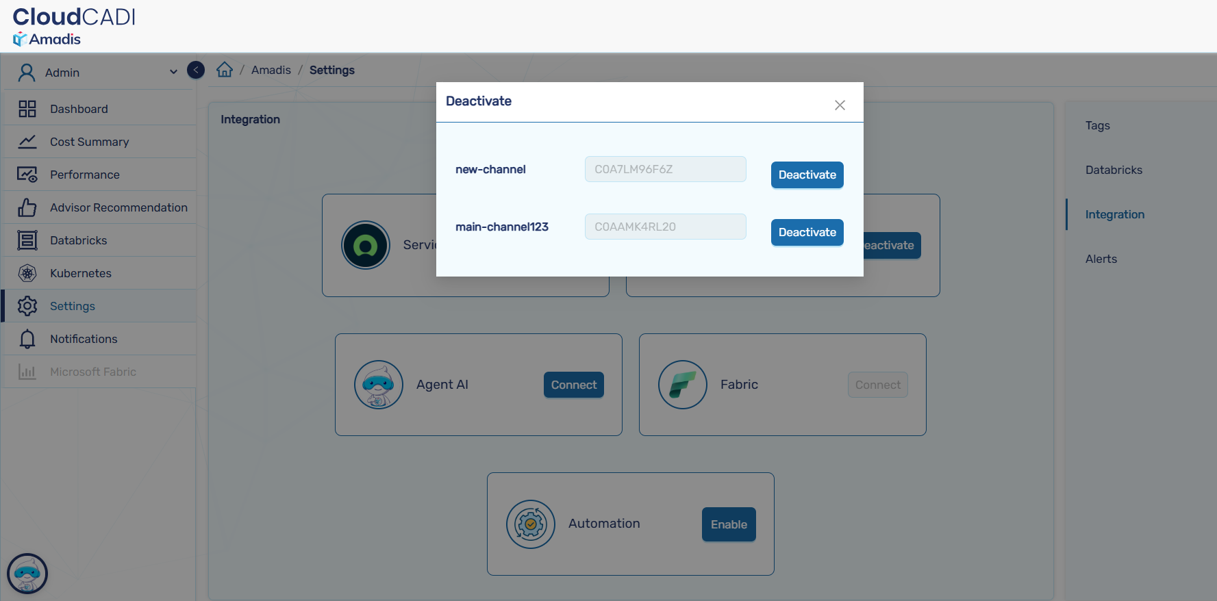 - Click Deactivate to deactivate a channel. The channel will no longer receive CloudCADI alerts.