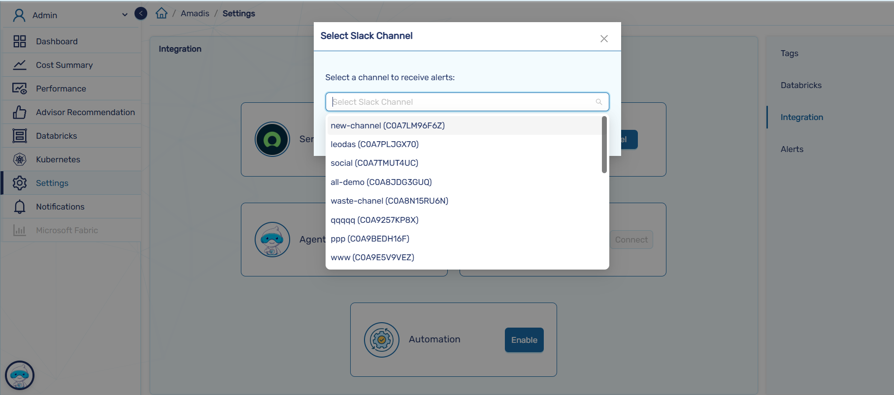 - Select the Slack channels that will receive CloudCADI alert messages.The CloudCADI app must be invited to each selected channel.