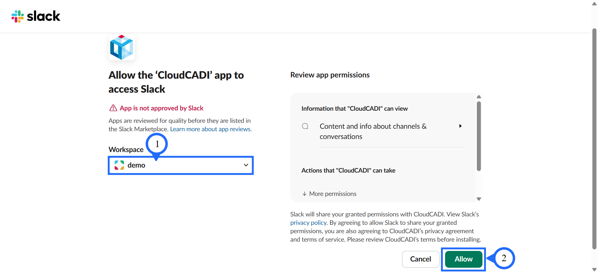 In the slack authorization page, select your Workspace and click Allow.