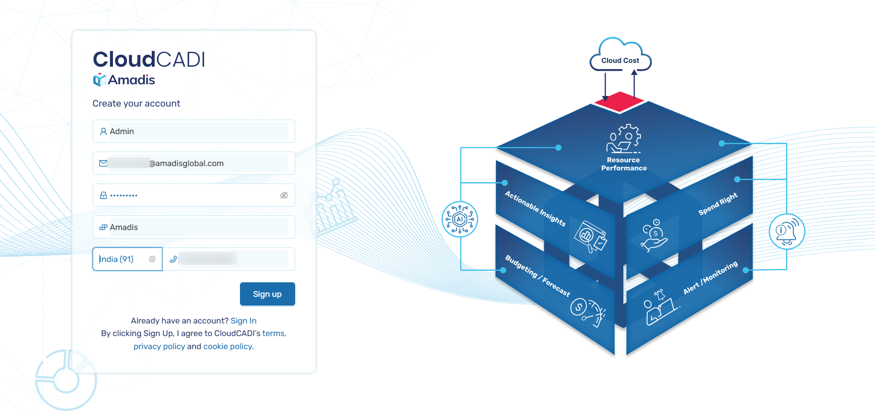 Create your account by entering your name, organization name, and phone number. After entering your details, click Sign up to proceed.