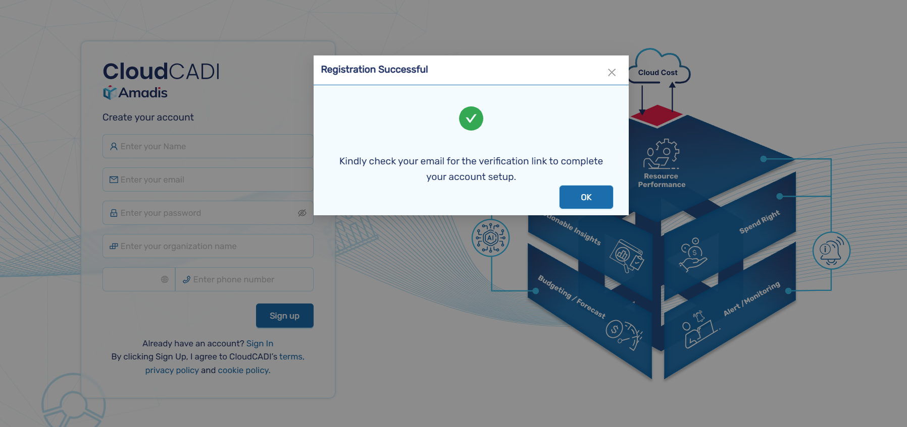A pop-up will appear confirming your Registration. You will receive an email to the Email address linked with your CloudCADI account to complete verification.